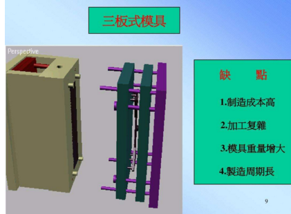 細(xì)水口模具又叫三板式模具,的流道及澆口不在分型線上,一般直接在產(chǎn)品上,所以我們在設(shè)計的時候多一組水口分模線,設(shè)計較為復(fù)雜,加工較困難,一般要視產(chǎn)品和客戶要求而選用細(xì)水口系統(tǒng)。這種模具的澆口位置選擇的地方比較多,而且開模時流道澆口與產(chǎn)品會自動分開,也省去了剪澆口這一步驟,被稱呼為三板式模具