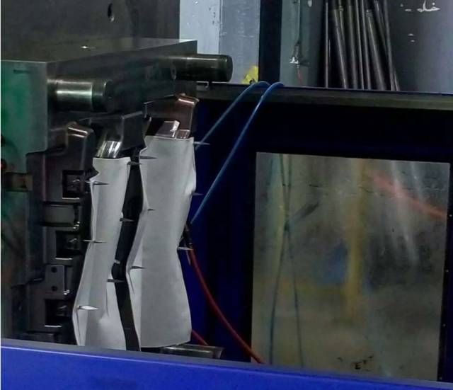 低壓注塑模具主要原理是注塑壓力較低在布上流動(dòng),開(kāi)模時(shí)要先把布掛到前模掛針上,合模、注塑、然后取件。