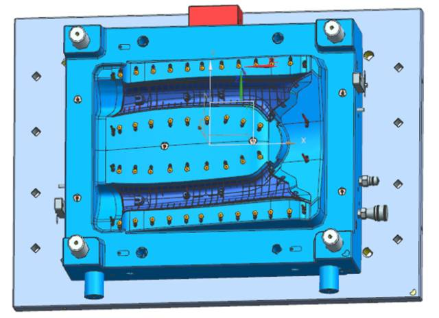 在汽車(chē)注塑模具中,針對(duì)汽車(chē)保險(xiǎn)杠產(chǎn)品,模具設(shè)計(jì)時(shí)通常會(huì)采用先進(jìn)的內(nèi)分型面技術(shù)。其優(yōu)點(diǎn)是分型夾線隱藏在保險(xiǎn)杠的非外觀面上,在汽車(chē)上裝配后看不到外觀夾線,不會(huì)影響產(chǎn)品外觀。但這種技術(shù)在難度與結(jié)構(gòu)上都要比外分型保險(xiǎn)杠復(fù)雜,技術(shù)風(fēng)險(xiǎn)也較高,模具成本與模具價(jià)格也會(huì)高于外分型保險(xiǎn)杠很多,但因外觀美觀,在中高檔汽車(chē)中被廣泛應(yīng)用。