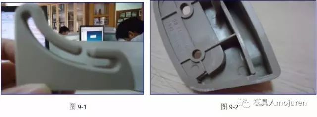 在這里制品仍做了1.2MM的反變形,澆口由原來(lái)的牛角進(jìn)膠改為現(xiàn)在的大水口搭底進(jìn)膠,分流道改為了S形,可防止主流道及分流道 的冷料進(jìn)入模腔。實(shí)際的試模產(chǎn)品如圖9-1、9-2所示,產(chǎn)品無(wú)變形